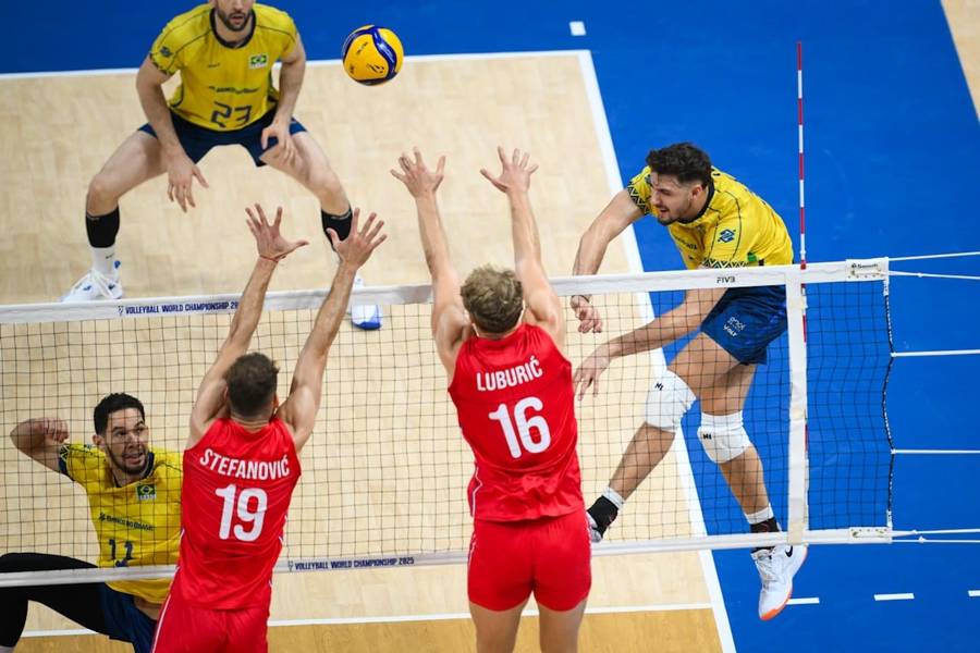 巴西男排(黄色球衣)完败给塞尔维亚男排